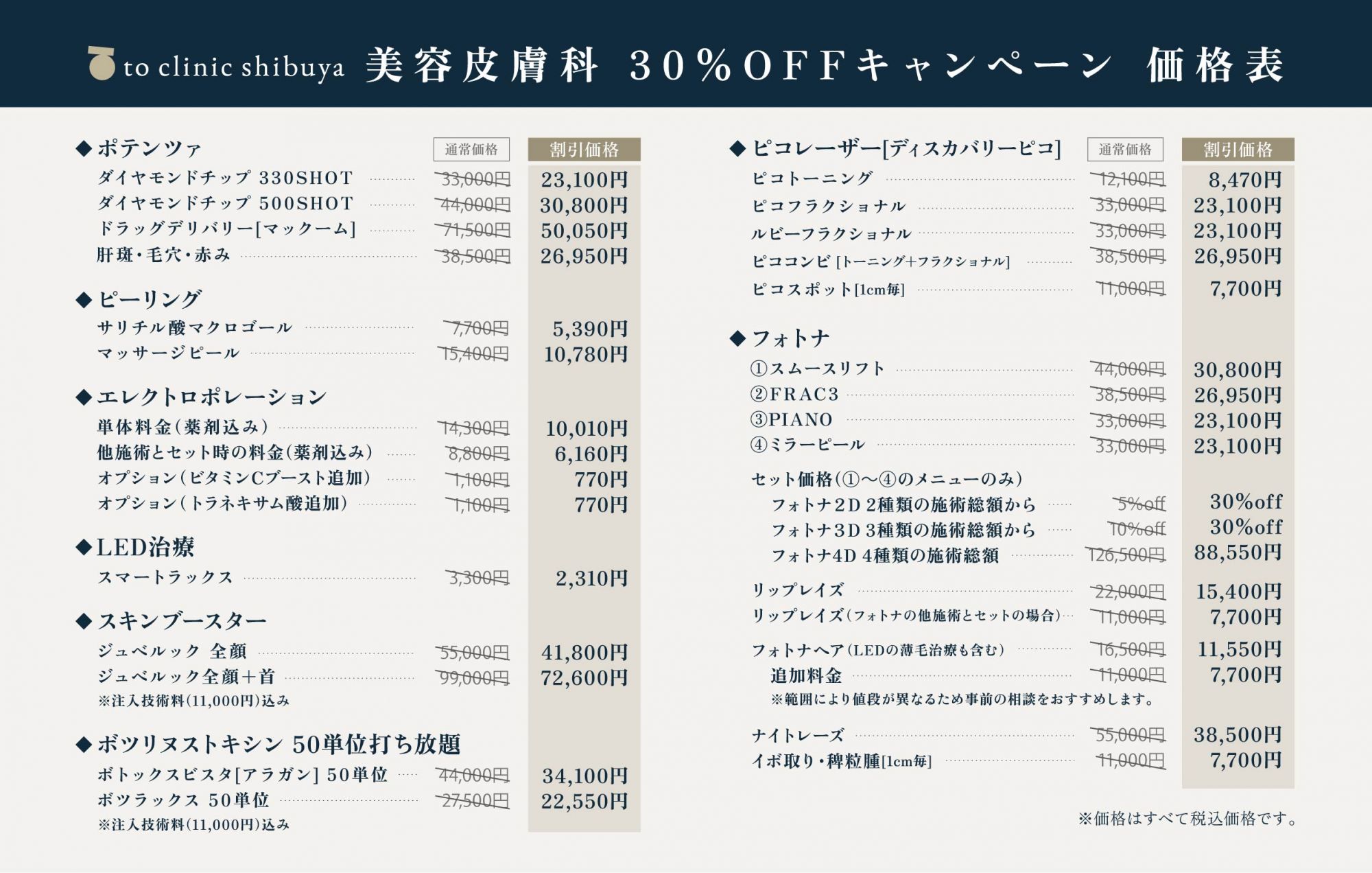 to clinic shibuyaでは、日頃のご愛顧に感謝を込めて対象の美容施術が 今だけ【30%OFF】キャンペーン!!を実施しておりますが、ご好評につき、9月30日まで期間延長いたしました。